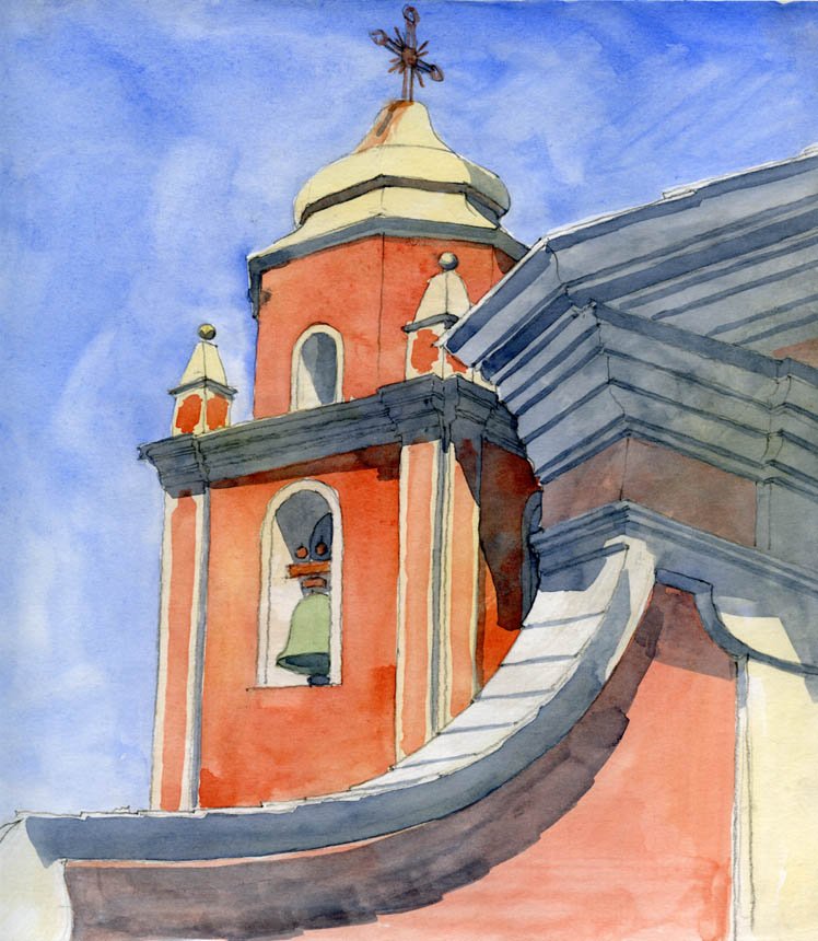 This beautiful and brightly coloured church is in Tellaro, a tiny village clinging to the rocks just above the Mediterranean sea on the border between Tuscany and Liguria. It has been rated as one of the most beautiful villages in Italy and rightly so. There is a little harbour where the locals still pull their tiny fishing boats up out of the water, and a beautiful covered alleyway where they then store the boats upside down - see this other sketch I made of it: covered Tellaro boat alleyway.
