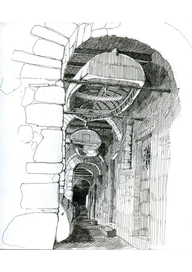 The architectural puzzle of it drew me in: that sequence of arches receding into darkness, the massive stone quoins framing the entrance, and the way the cross-hatching could build up the deep shadows while keeping the sense of depth. Working in pen, I had to commit to each mark - there's no going back - which suits my style.