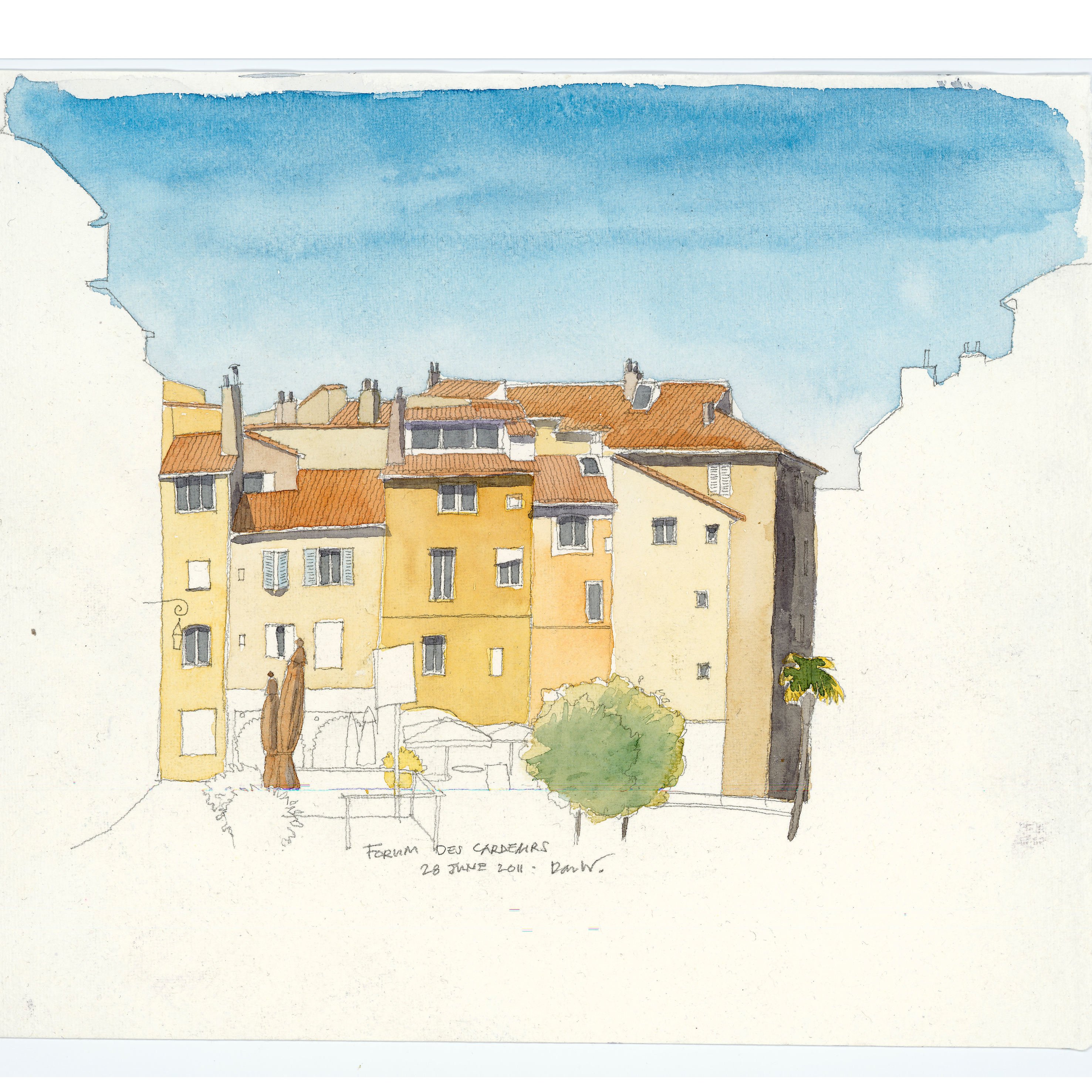 I painted this view of the Forum des Cardeurs in Aix-en-Provence on a bright June morning in 2011.