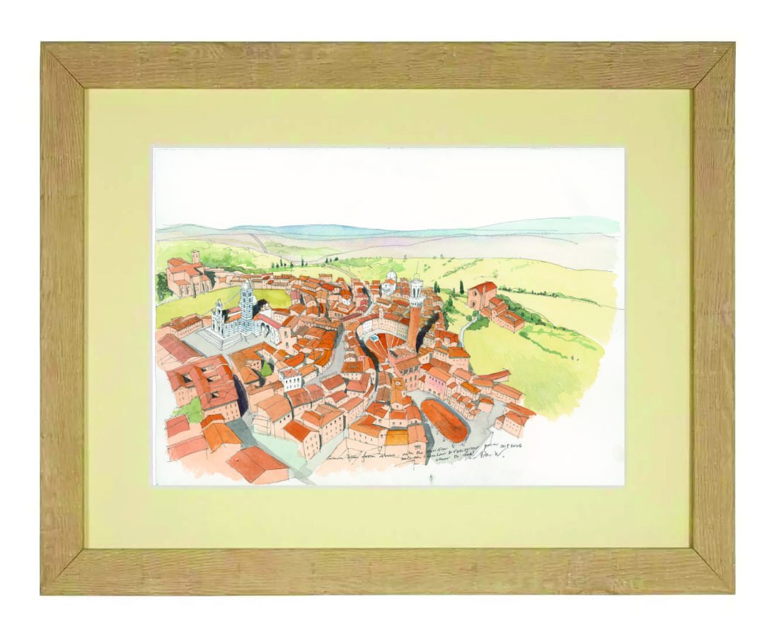 I drew this bird's-eye view of Siena in October 2016, trying to capture the main directives of the city, built along the Frankish pilgrimage route, and formed by the rivalry between local government and the power of the church. The two main markers in the city are the Duomo and the shell-shaped Piazza del Campo with the tall tower of the "Mangia" in front of it.